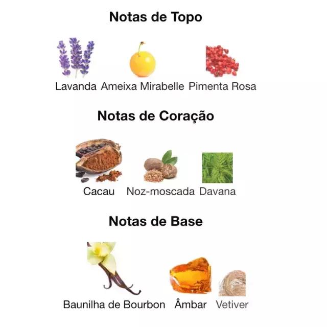 Notas de Coração: Cacau, Noz-Moscada e Davana